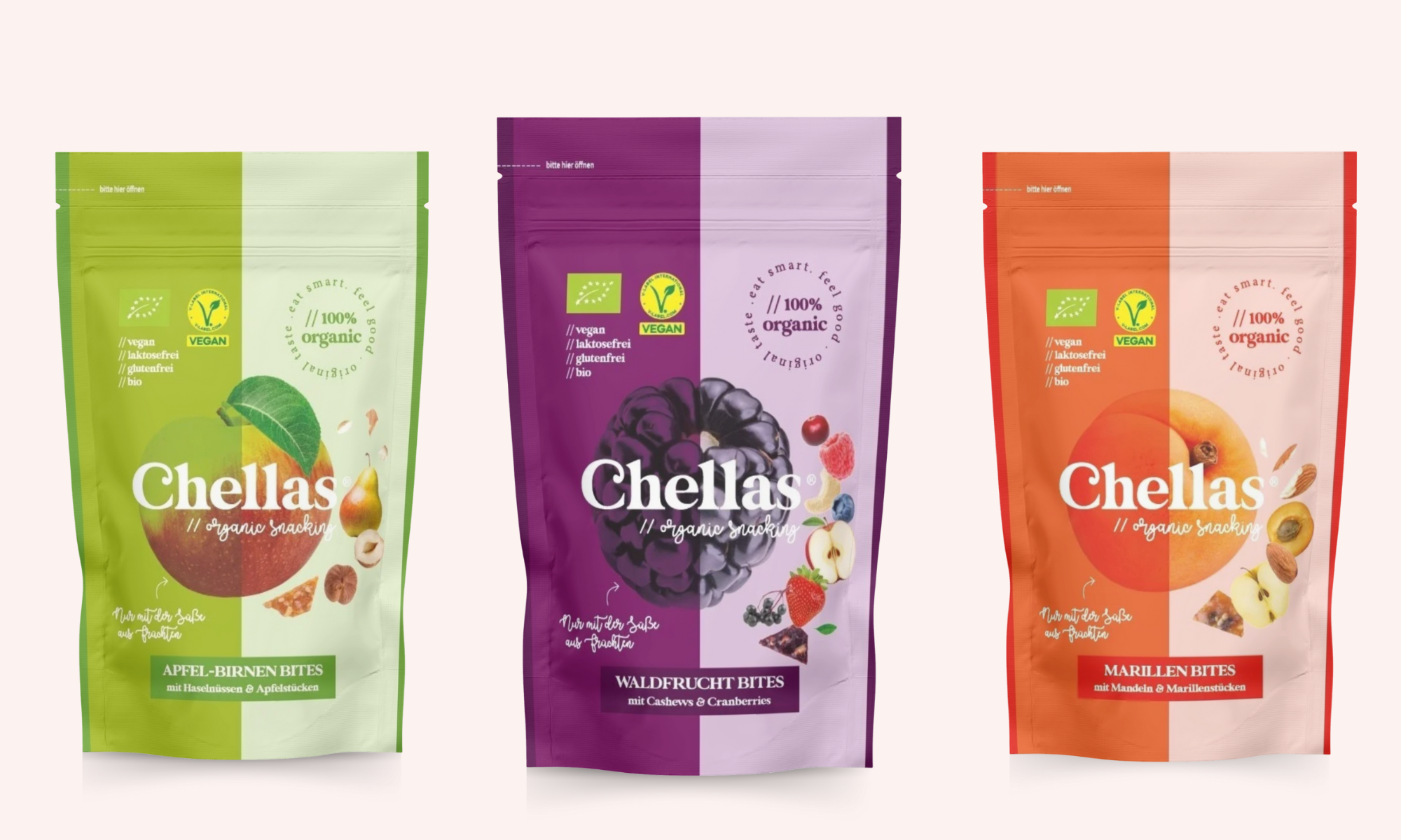 Chellas bio Fruchtbites sind eine nachhaltige Alternative zu herkömmlichen süßen Snacks. Der innovative, vegane Bio Snack aus hochwertigen Früchten, feinen Trockenfrüchten und wertvollen Nüssen wird in ehrlicher Handarbeit in Österreich hergestellt.